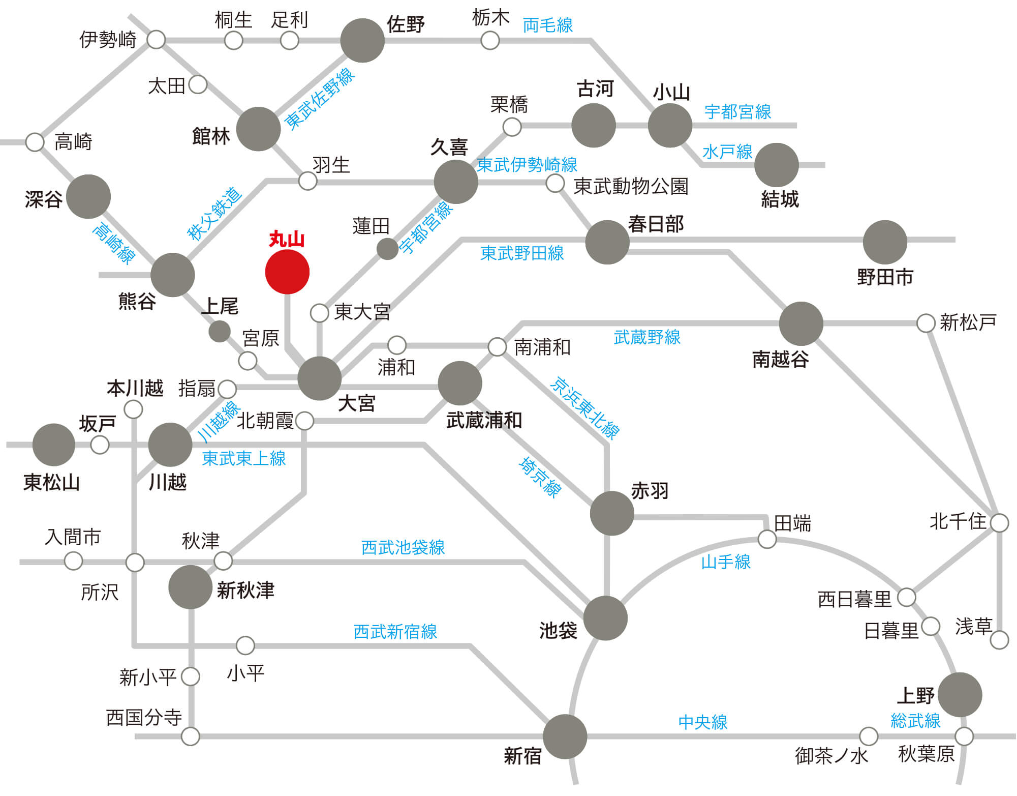 • JR宇都宮線蓮田駅西口からがんセンター行きバス15分丸山駅バス停下車